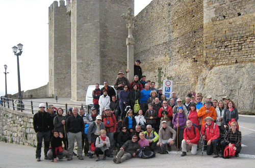 A las 08:50 horas, los 60 peregrinos ya están dispuestos ante el crucero de la Puerta de San Mateo para la habitual foto de grupo. Seguidamente se aprestan a iniciar la jornada con el primer tramo de 8,7 km hasta la pedanía de Xiva de Morella.