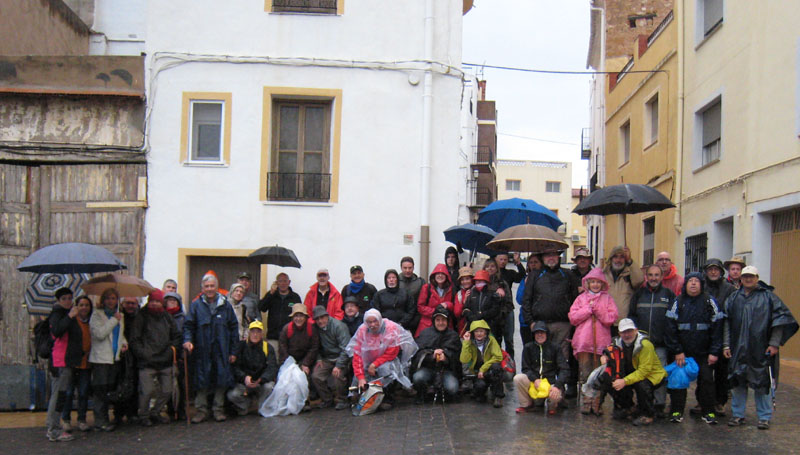 08:20: El grupo de 49 peregrinos, bajo una lluvia implacable, antes de iniciar la jornada en Sierra de Engarcerán.